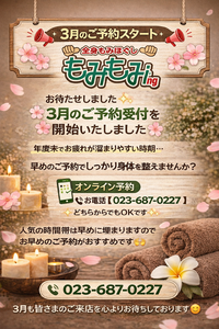 【3月のご予約受付開始】 全店舗 あかねヶ丘店 南三番町店 天童老野森店 長井店 米沢イオン店 2026/2/19 📢【3月ご予約受付中】📢 新生活前にしっかり整えるチャンス🌸 3月のご予約、ただいま受付中です! 季節の変わり目は 首・肩・腰の不調が出やすい時期。 早めのケアでスッキリ新年度を迎えませんか?✨ ご予約は 📱オンライン予約 📞023−687−0227 から可能です! 【もみもみing】県内5店舗 ✳️あかねヶ丘店 ✳️南三番町店 ✳️天童店 ✳️イオン米沢店 ✳️長井店 週末・夕方は埋まりやすくなっております🙇♂️ ご希望のお時間はお早めに✨ 皆さまのご来店、心よりお待ちしております😊 前の記事へ【長井店限定】移転1周年記念キャンペーン